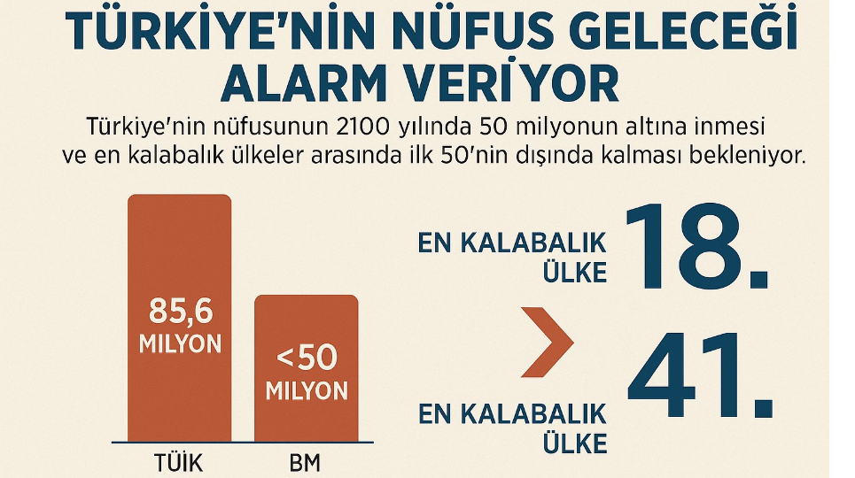 TÜİK verilerine göre Türkiye’nin nüfusu 85,6 milyon, BM temelli uluslararası tahminlere göre ise 87,7 milyon civarında. Uzmanlar, 2100’de bu rakamın 50 milyonun altına inebileceği ve ülkenin dünya sıralamasında ilk 50’nin dışına düşebileceği uyarısında bulunuyor.
