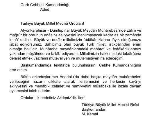 Batı cephesinde Yunanlılar karşısında bulunan ordumuzun, 26 Ağustos 1922’de hücuma geçerek kazandığı seri zaferler hepinizin bildiği gibi, kısa bir sürede Batı Anadolu’yu Yunanlılardan temizlemiştir. Aynı darbenin etkisi ile düşmanlarımız, Doğu Trakya’yı da boşaltarak hükümetimize teslim etmeye zorlanmışlardır. Dünya kubbesi altında yapılan savaşlar arasında, bütün nitelikleri ile en önemli bir yer taşıyan bu büyük savaşın öneminin değerlendirilmesini tarihe bırakıyorum. Zaferin, her türlü övülmenin üstünde bulunan kahraman sahipleri konusunda da fazla söz söylemeyi gereksiz sayıyorum.” 1 Mart 1923